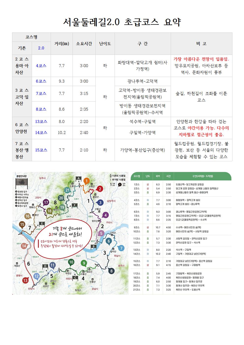 초급자분을 위해서 난이도 하의 서울둘레길2.0 코스를 아래에 추천합니다. 평지이면서 아름다운 경관이 일품이고 야간에도 가능한 코스가 있습니다. 확인해 보시고 즐겁고 안전하게 둘레길 걸어보시면 좋을 듯 합니다.